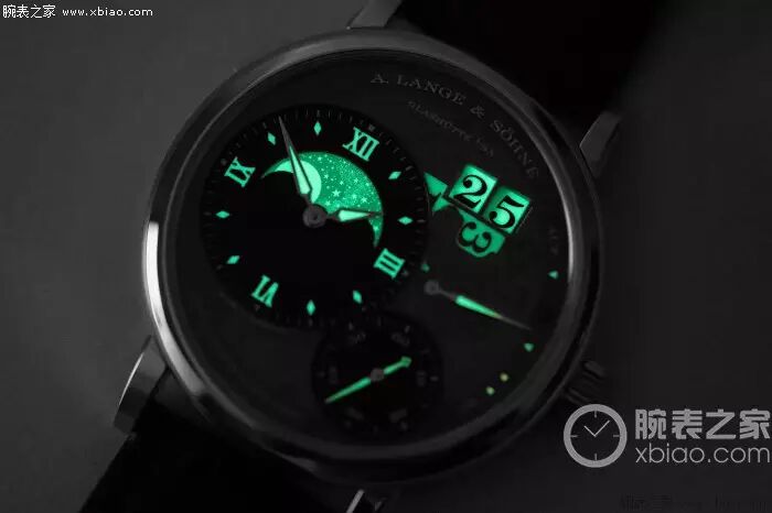 朗格的月相,我想有两只表是非常值得一说的,一只是Grand Lange 1 Moonphase “Lumen”,一只是Richard Lange “Terraluna”。先来说说Grand Lange 1 Moonphase “Lumen”,这是目前我所知道的唯一一只在晚上也可以欣赏月相的腕表,因为它的月相带有朗格专利的夜光层。绝大多数的月相腕表,是由一个带有夜空的金属圆盘来指示的,在这个圆盘上不具有夜光涂层,所以一旦到了晚上,除非在灯光下,一般看不到月相,甚至白天也不是都能看到,时常看起来会是一个黑漆漆的半圆形窗口。而朗格经过特殊的设计,在大月相的底部,放置了一个带有夜光涂层的背景层,从而让月相即便在黑夜,也可以释放光芒,这是目前我们所看到的唯一一只夜光月相。