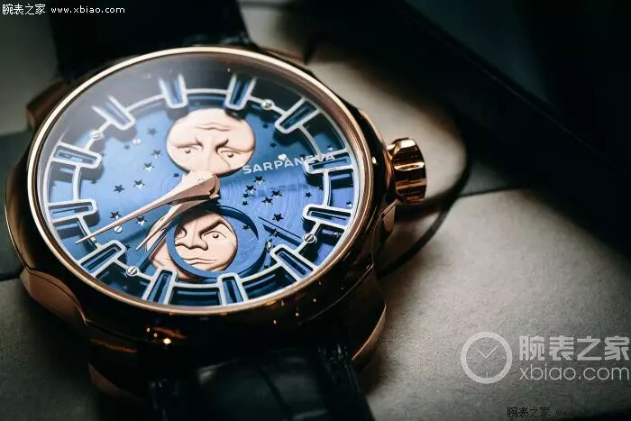 不过,要说月相真正做的“眉飞色舞”的,应该算芬兰独立制表品牌Stepan Sarpaneva,它的月亮脸基本就按照了挤眉弄眼的古怪表情来设计,并且带月相的表都给了月相一个很大的展示空间,甚至一整个表盘就是这样一张脸,这种不拘一格、突破常规的表现方式,倒是很有视觉冲击力,也难怪这个牌子时间做的并不长,但国内外的玩表圈里已经很流行了。正因为这样,它还和很多品牌合作,为其他品牌提供过这个标志性的挤眉弄眼月亮脸,其中就包括MB&F的青蛙表。